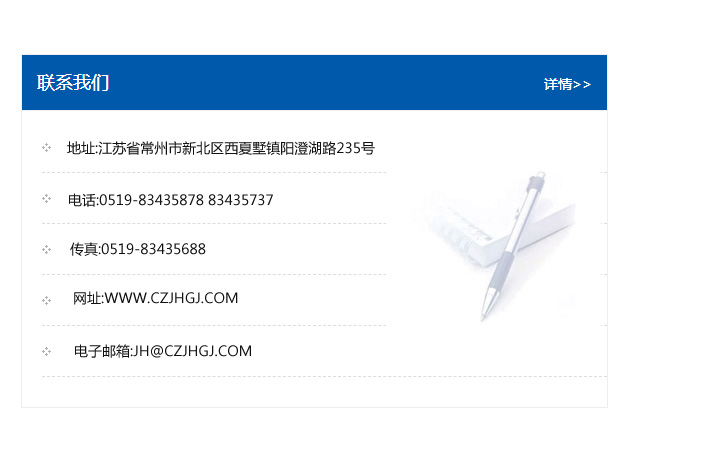 傳真:0519-83435688    郵編:213135    網址:WWW.czjhgj_com.puni-china.com    電子郵箱:JH@czjhgj_com.puni-china.com